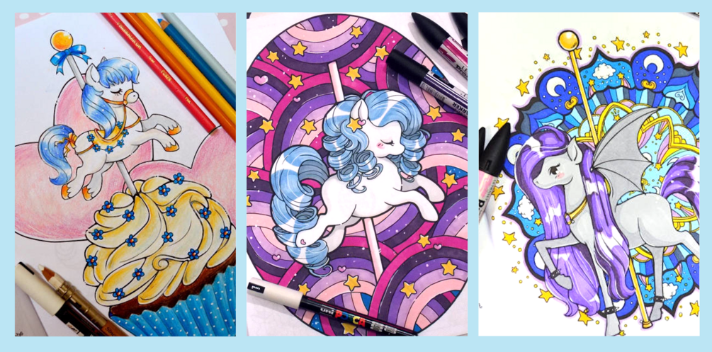 40 carousel-themed coloring pages by YamPuff, available as a downloadable PDF eBook and as individual .PNGs