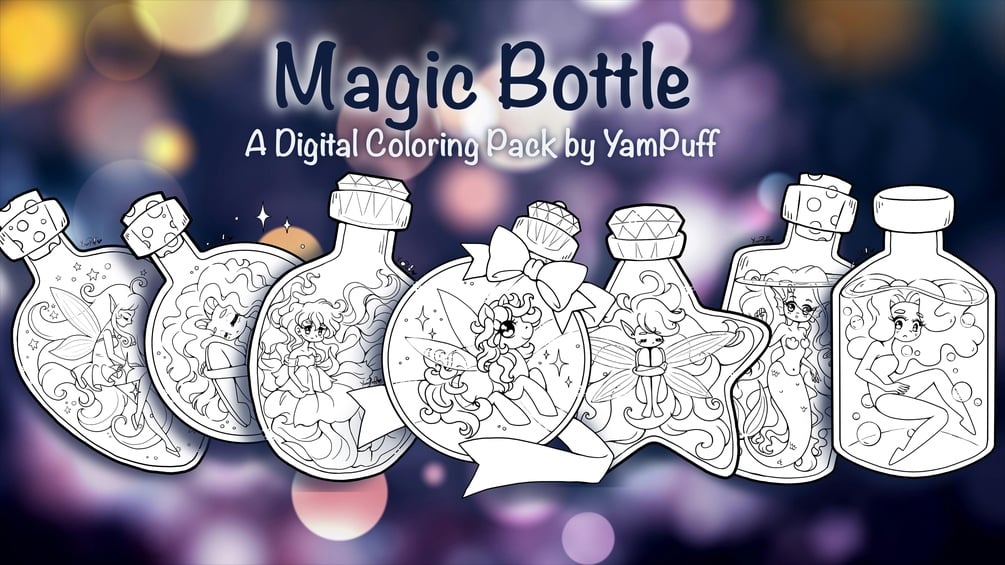 Based on YamPuff's 2018 Inktober illustrations, Magic Bottle is a collection of 7 whimsical illustrations featuring small creatures residing in magical bottles. Bring these illustrations to life with your colors and imagination!