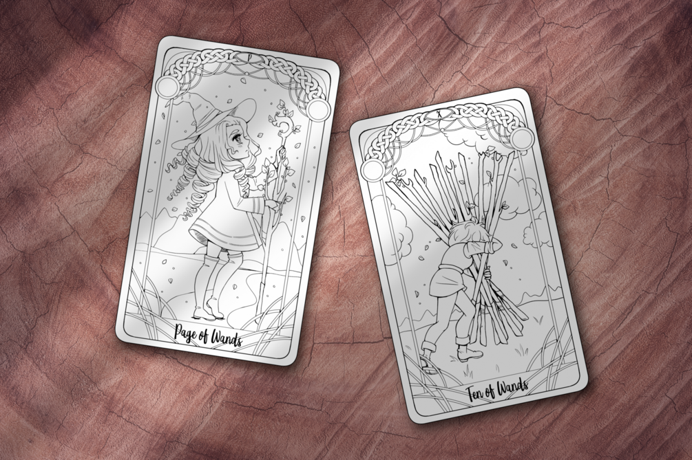 Previously, I released the Wands cards in Part One and Part Two. Now, I’ve bundled the entire Wands set together in one pack — and as a special bonus, I’ve added the meanings of each card alongside the coloring pages. 🃏